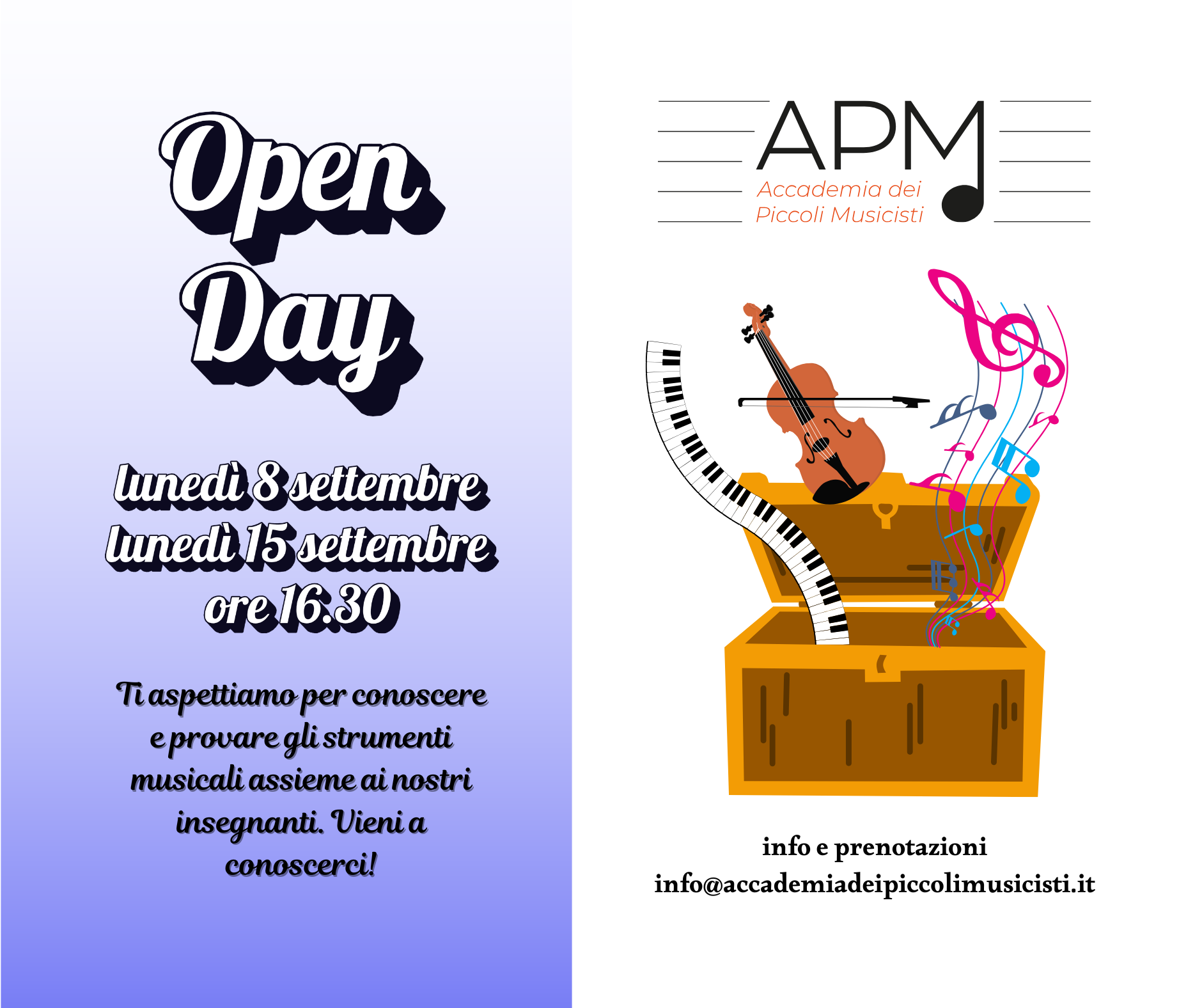Siete invitati a partecipare a due pomeriggi speciali all’Accademia dei Piccoli Musicisti: l’Open Day è l’occasione ideale per visitare la scuola, incontrare i nostri insegnanti e sperimentare gli strumenti musicali in un clima accogliente e creativo.